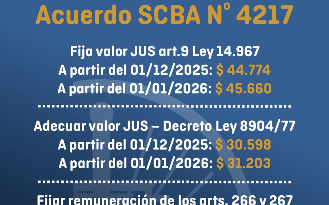 Readecuación del valor del Jus desde el 1º de diciembre de 2025 y 1º de enero de 2026 como así también del valor del Jus arancelario decreto-ley 8904/77 (Acuerdo Nº 4217, Arts. 1º y 2º).