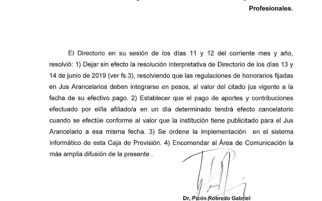 Con la firma del Secretario Gabriel Picón Robredo, el texto dice lo siguiente: “El Directorio en su sesión de los días 11 y 12 del corriente mes y año, resolvió: 1) Dejar sin efecto la resolución interpretativa de Directorio de los días 13 y 14 de junio de 2019 (ver fs.3), resolviendo que las regulaciones de honorarios fijadas en Jus Arancelarios deben integrarse en pesos, al valor del citado jus vigente a la fecha de su efectivo pago. 2) Establecer que el pago de aportes y contribuciones efectuado por el/la afiliado/a en un día determinado tendrá efecto cancelatorio cuando se efectúe conforme al valor que la institución tiene publicado para el Jus Arancelario a esa misma fecha. 3) Se ordene la implementación en el sistema informático de esta Caja de Previsión. 4) Encomendar al Área de Comunicación la más amplia difusión de la presente.