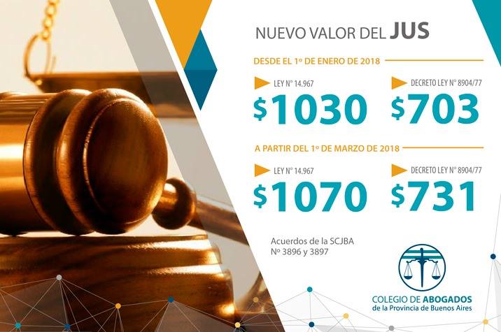 “… 1.– Fijar el valor del “Jus” conforme art. 9 de la Ley 14.967 con vigencia: desde el 1º de enero de 2018 en la suma de pesos un mil treinta ($ 1.030) y a partir del 1º de marzo de 2018 en la suma de pesos un mil setenta ($ 1.070).